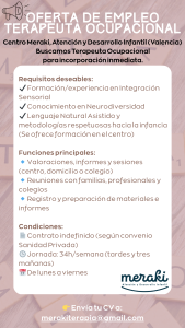 En Meraki seguimos creciendo y ampliando nuestro equipo. Abrimos una oferta de trabajo para terapeuta ocupacional, dirigida a profesionales que compartan nuestra mirada respetuosa hacia la infancia y el acompañamiento a las familias.